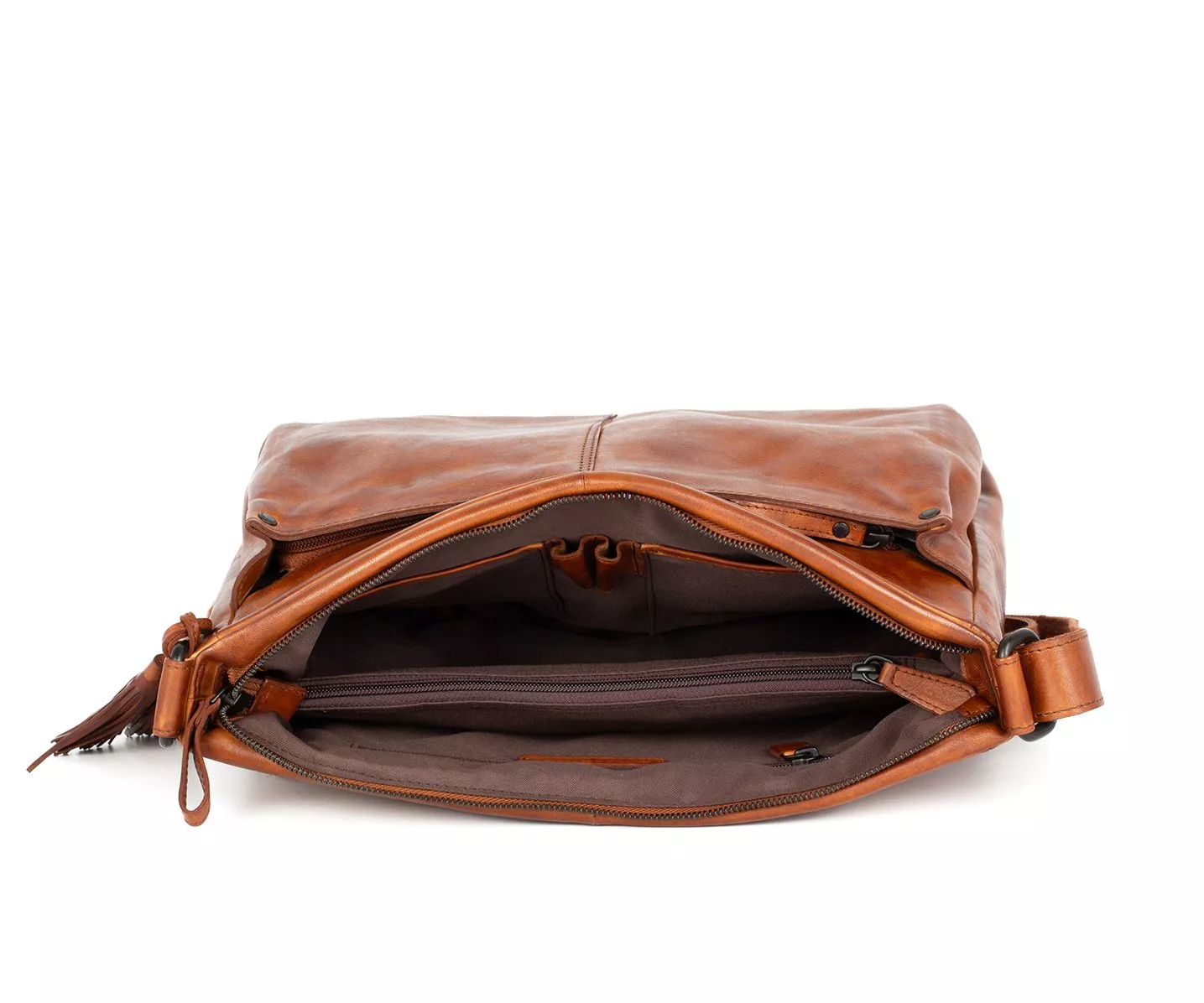 Exterieur: voorvak met rits, hoofdvak met rits, achtervak met rits, decoratie kwastjes
