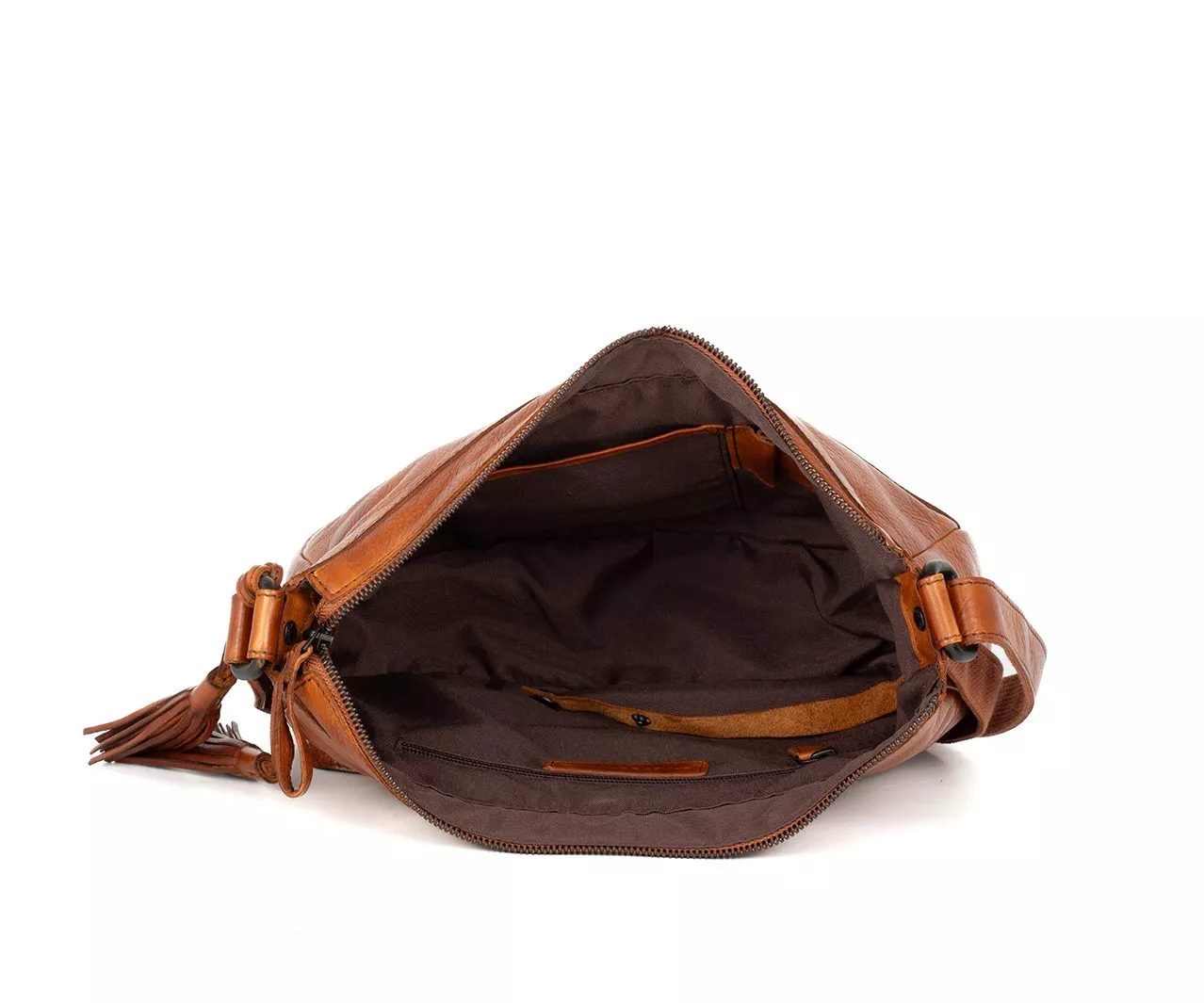 Exterieur: insteek voorvak, hoofdvak met rits, achtervak met rits, leren tassels
