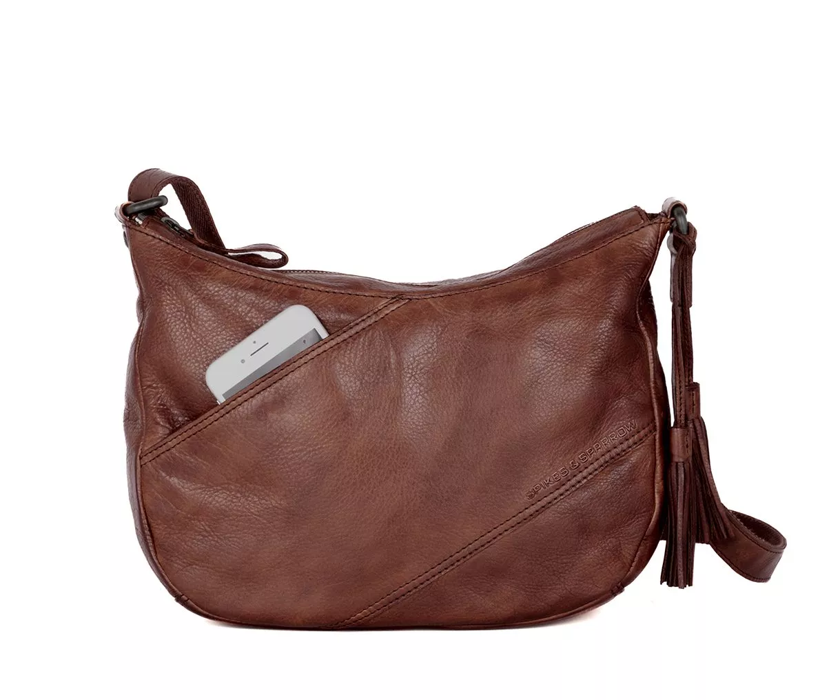 Het ontwerp van de Lorain is krachtig in zijn eenvoud. Aan de voorzijde bevindt zich een verborgen insteekvak met magneetsluiting, ideaal voor items die je snel bij de hand wilt hebben. Het Spikes & Sparrow-logo is subtiel in het leer gedrukt en vormt samen met de strakke lijnen en het verfijnde stikwerk een rustige, uitgebalanceerde uitstraling. Als speels detail is aan de zijkant van de tas een leren kwastje bevestigd, dat zorgt voor een zacht accent zonder afbreuk te doen aan het stoere karakter.