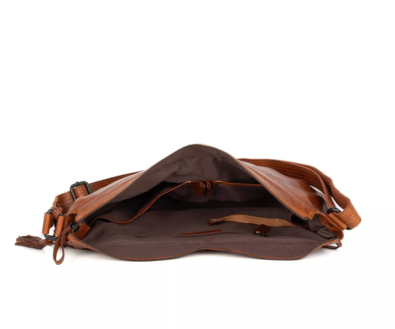 Kleur: Donkerbruin Afmeting: 43 x 3 x 30 cm Materiaal: Apache leer Exterieur: hoofdvak met rits, 2 achtervakken met rits, decoratie kwastjes Interieur: ritsvak, 2 insteek vakken, 2 pennenlusjes, sleutellusje Hengsels en banden: vaste/verstelbare lange schouderband Garantie: 2 jaar