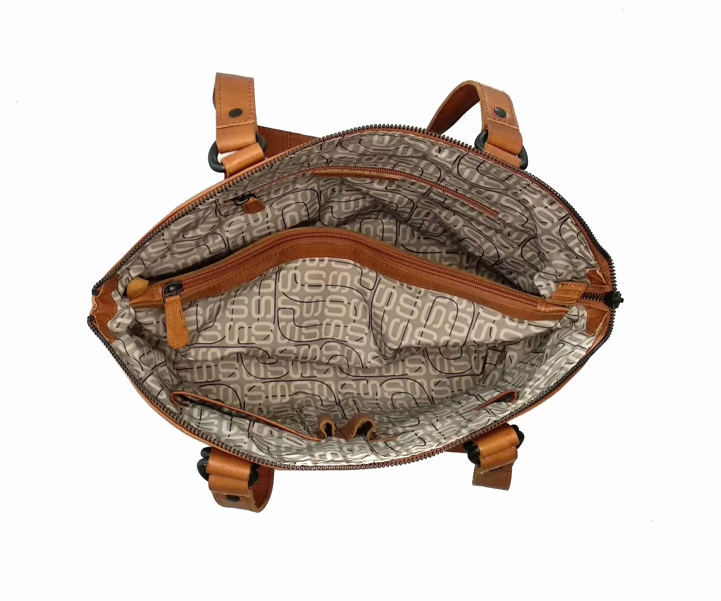 De Durango brandy biedt dezelfde doordachte indeling als de andere kleuren, maar krijgt door de lichtere tint een extra elegante uitstraling aan de binnenkant. Het ruime hoofdcompartiment opent soepel met een stevige rits en biedt voldoende ruimte voor je dagelijkse essentials, zoals een portemonnee, toiletzakje, agenda, waterfles of notitieboek.