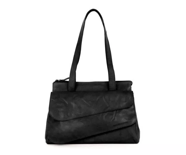 Zwart leren handtas Rivka is een ware blikvanger in de collectie van Spikes & Sparrow. De tas combineert stoere elegantie met een speels lijnenspel, en is daarmee ideaal voor vrouwen die houden van een statement piece dat ook praktisch is. De opvallende asymmetrische flap aan de voorzijde geeft de tas haar eigenzinnige, moderne uitstraling.