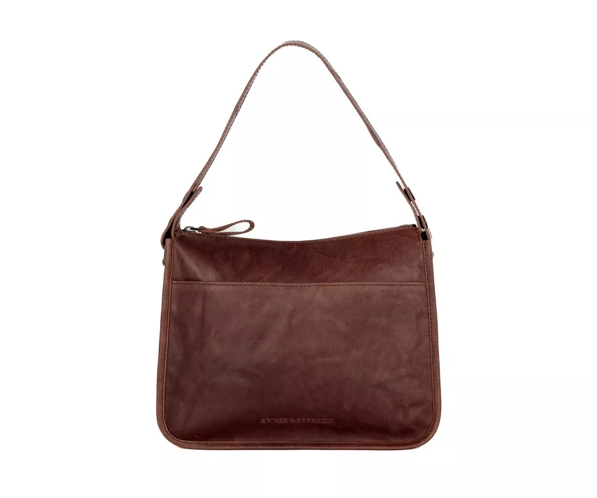 De donkerbruine Spikes & Sparrow Chanice straalt rust, warmte en verfijning uit. Deze diepe chocoladetint benadrukt de natuurlijke nuances en de zachte glans van het Bronco leer, waardoor de tas een tijdloze en rustige uitstraling krijgt. De licht afgeronde vorm maakt de tas vrouwelijk, terwijl de subtiele details zoals de afneembare korte band en de elegante voorvakken zorgen voor een stijlvolle finishing touch.