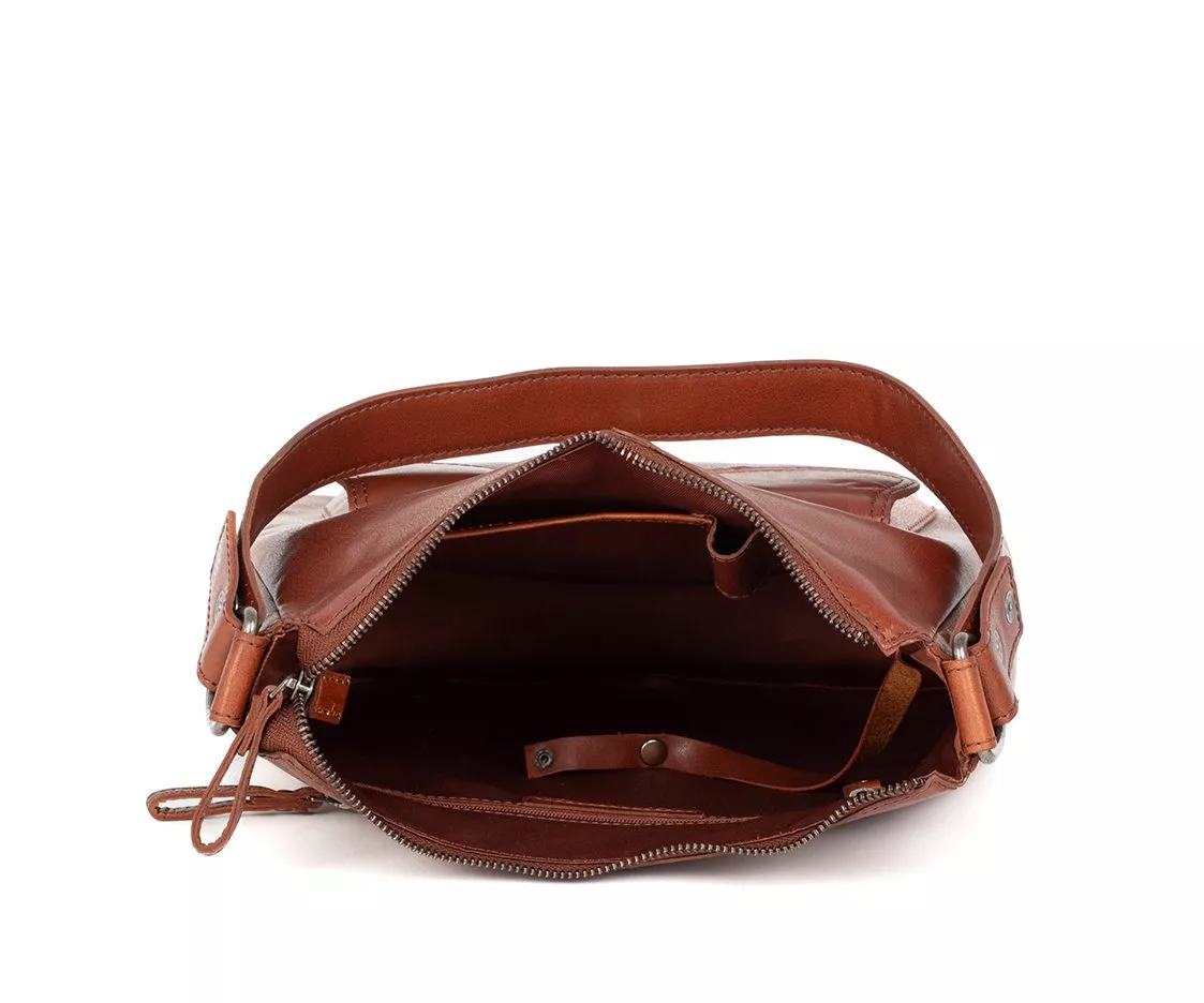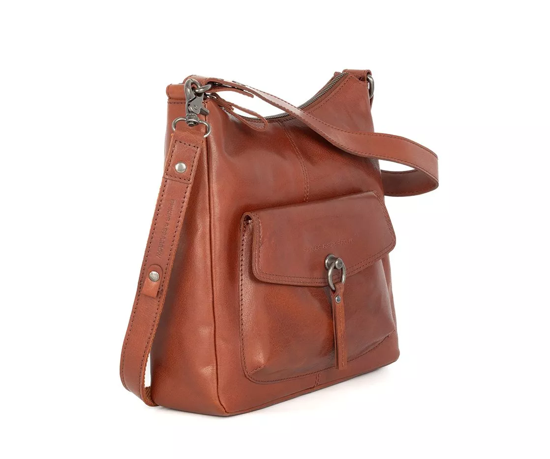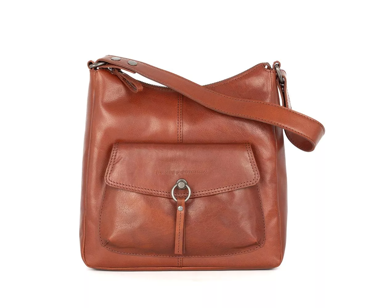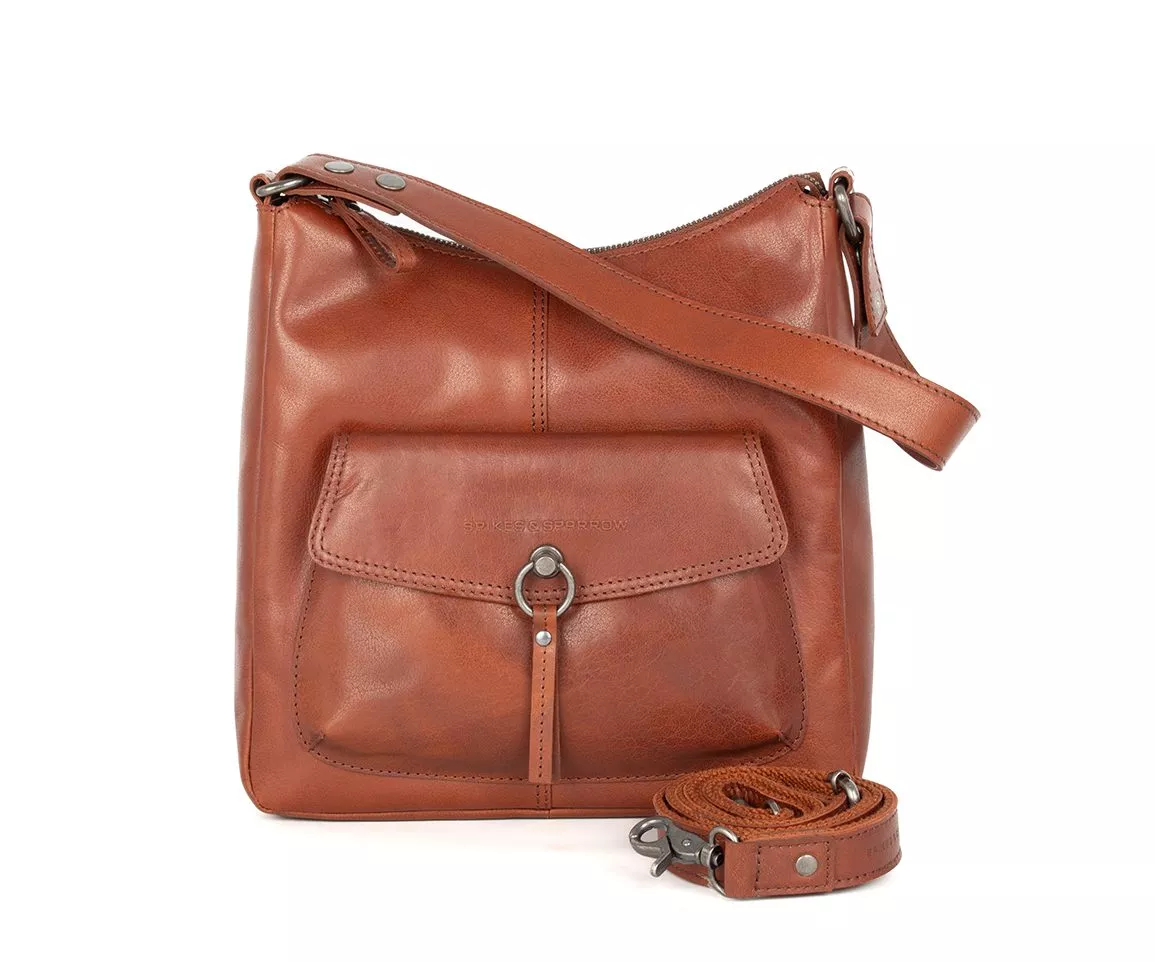De Spikes & Sparrow Cydney in brandy is een leren schoudertas voor dames die warmte, elegantie en karakter moeiteloos combineert. De cognackleurige tint geeft deze tas een levendige uitstraling en laat het Bronco leer prachtig tot zijn recht komen. Subtiele kleurnuances en natuurlijke nerfstructuren zorgen ervoor dat elke tas uniek is. Aan de voorzijde trekt het metalen ornament met ring en leren koord direct de aandacht. Het logo dat verfijnd in het leer is gedrukt op het voorvak benadrukt het vakmanschap en de herkenbare stijl van Spikes & Sparrow.
