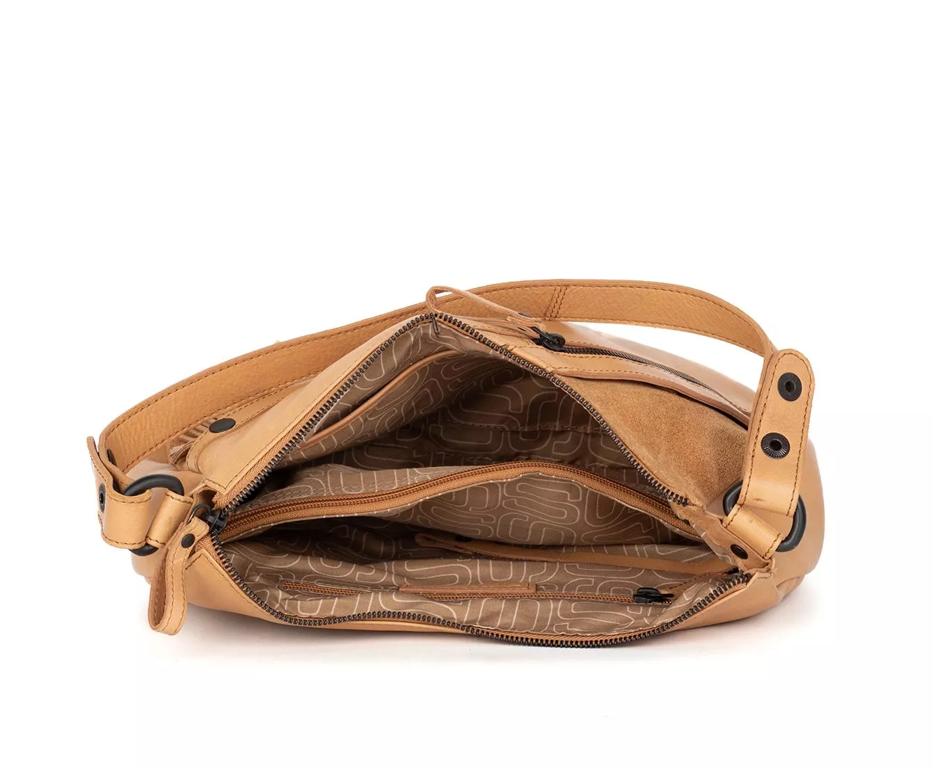 Ook aan de binnenkant is de Jadeline praktisch en doordacht ingedeeld. Het hoofdvak sluit met een rits en is voorzien van een middenverdeler met rits, waardoor je de tas overzichtelijk kunt organiseren. Daarnaast beschikt de tas over een insteekvak, een ritsvak en een sleutelring, zodat je je dagelijkse essentials snel terugvindt. Alles heeft zijn eigen plek, zonder dat de tas rommelig aanvoelt.