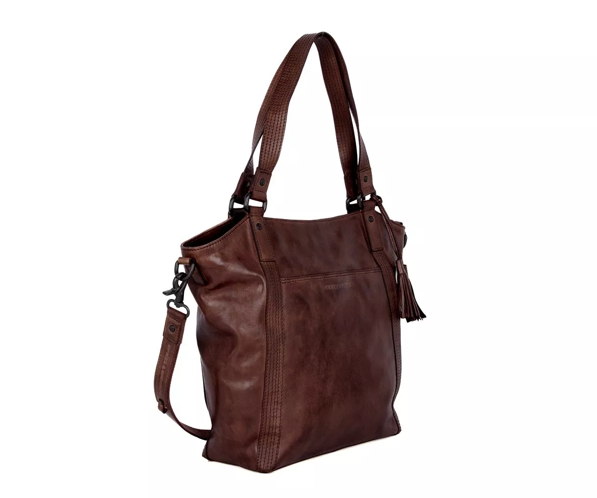 Kleur: Donkerbruin Afmeting: 27 x 10,5 x 30 cm Materiaal: Apache leer Exterieur: insteek voorvak met magneetsluiting, hoofdvak met rits, achtervak met rits, decoratie kwastjes Interieur: ritsvak, 2 insteek vakken, 2 pennenlusjes, sleutellusje Hengsels en banden: 2 vaste schouderbanden, afneembare/verstelbare lang schouderband Garantie: 2 jaar