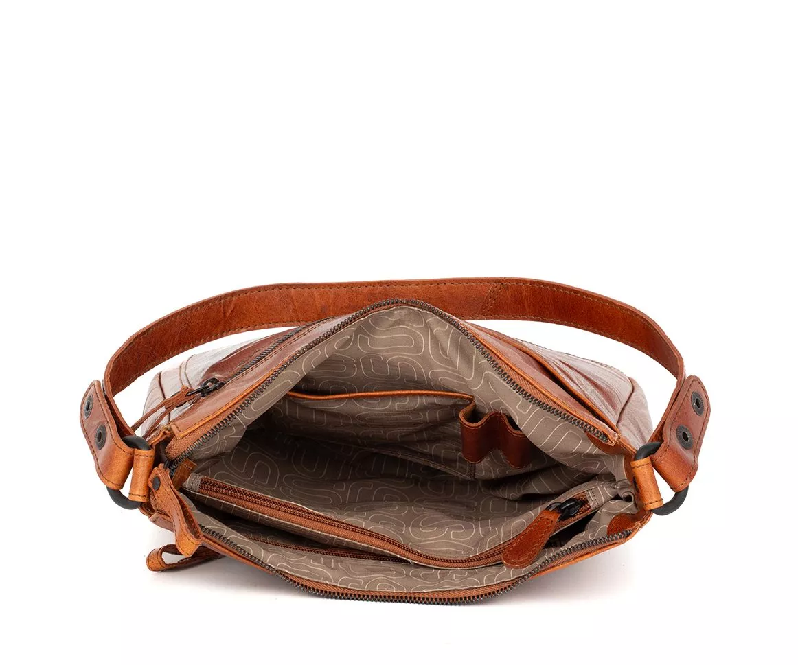 De buitenzijde van de Lillia is uitgerust met meerdere vakken: een insteek voorvak, een ruim voorvak met rits, een achtervak met rits, en uiteraard het grote hoofdvak. Binnenin vind je een ritsvak, een tussenschot met rits, een insteekvak, twee pennenlusjes en een sleutellusje. Alles wat je dagelijks nodig hebt โ van telefoon en sleutels tot make-up, bril of notitieboekje โ berg je overzichtelijk en veilig op.
